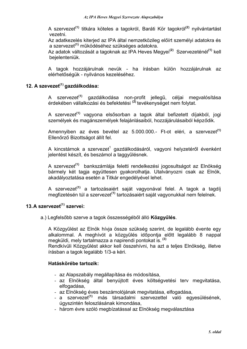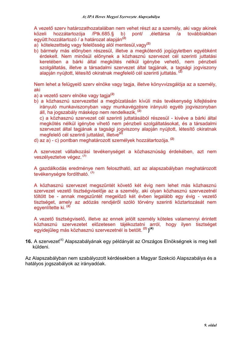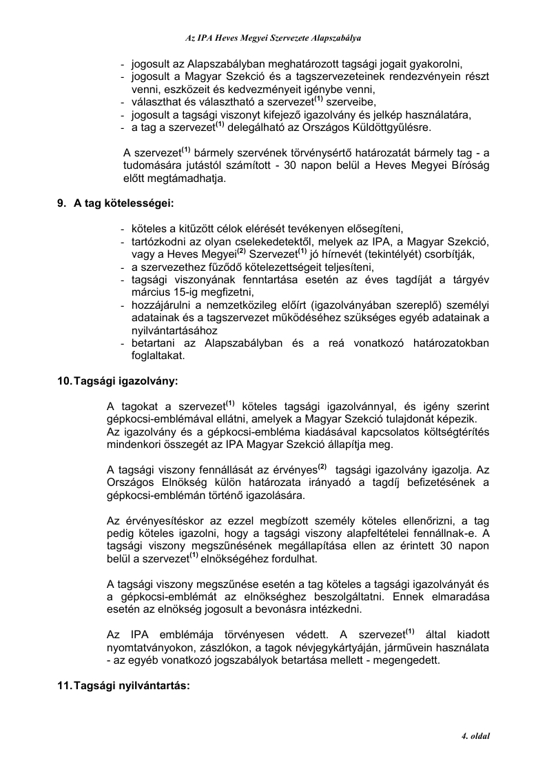 3. Jogállása: az IPA Heves Megyei Szervezete(1) az IPA Magyar Szekció Elnökségének irányításával végzi munkáját, mint önálló jogi személy (törölve: „Az egyesülési jogról szóló” 1989. évi II. törvény 2. §. (4) bekezdése alapján.