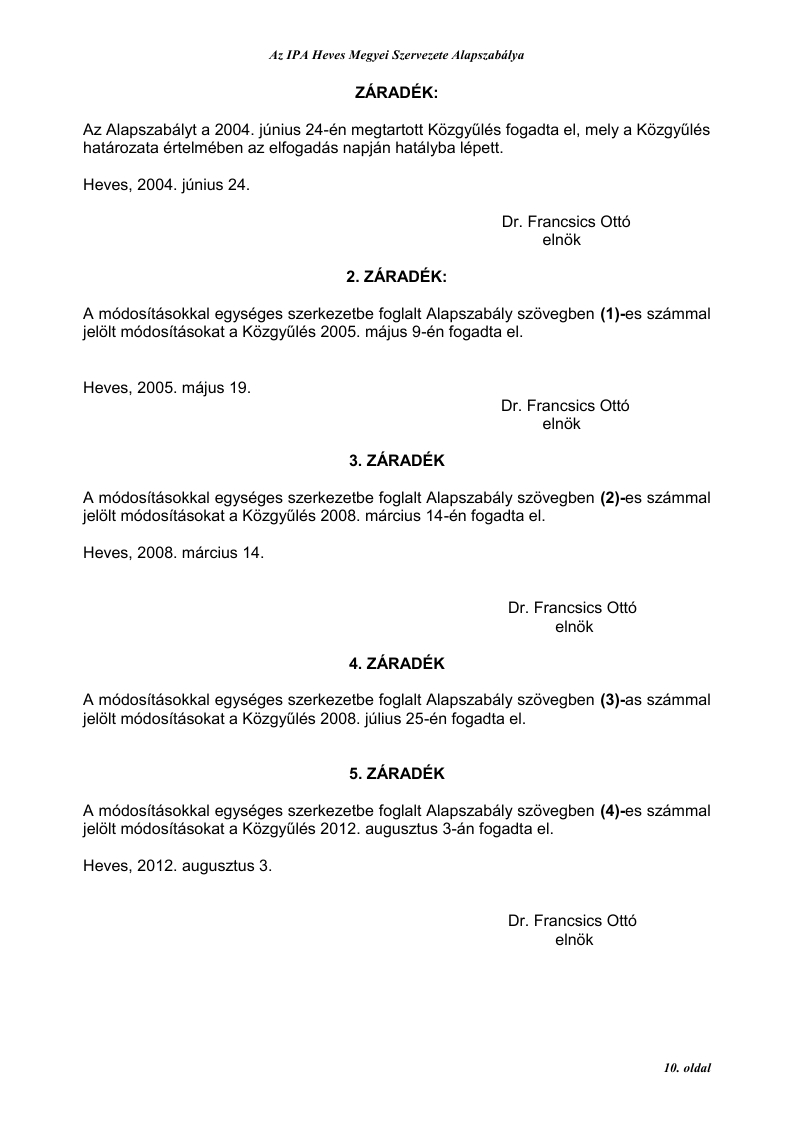 A módosításokkal egységes szerkezetbe foglalt Alapszabály szövegben (4)-es számmal jelölt módosításokat a Közgyűlés 2012. augusztus 3-án fogadta el.